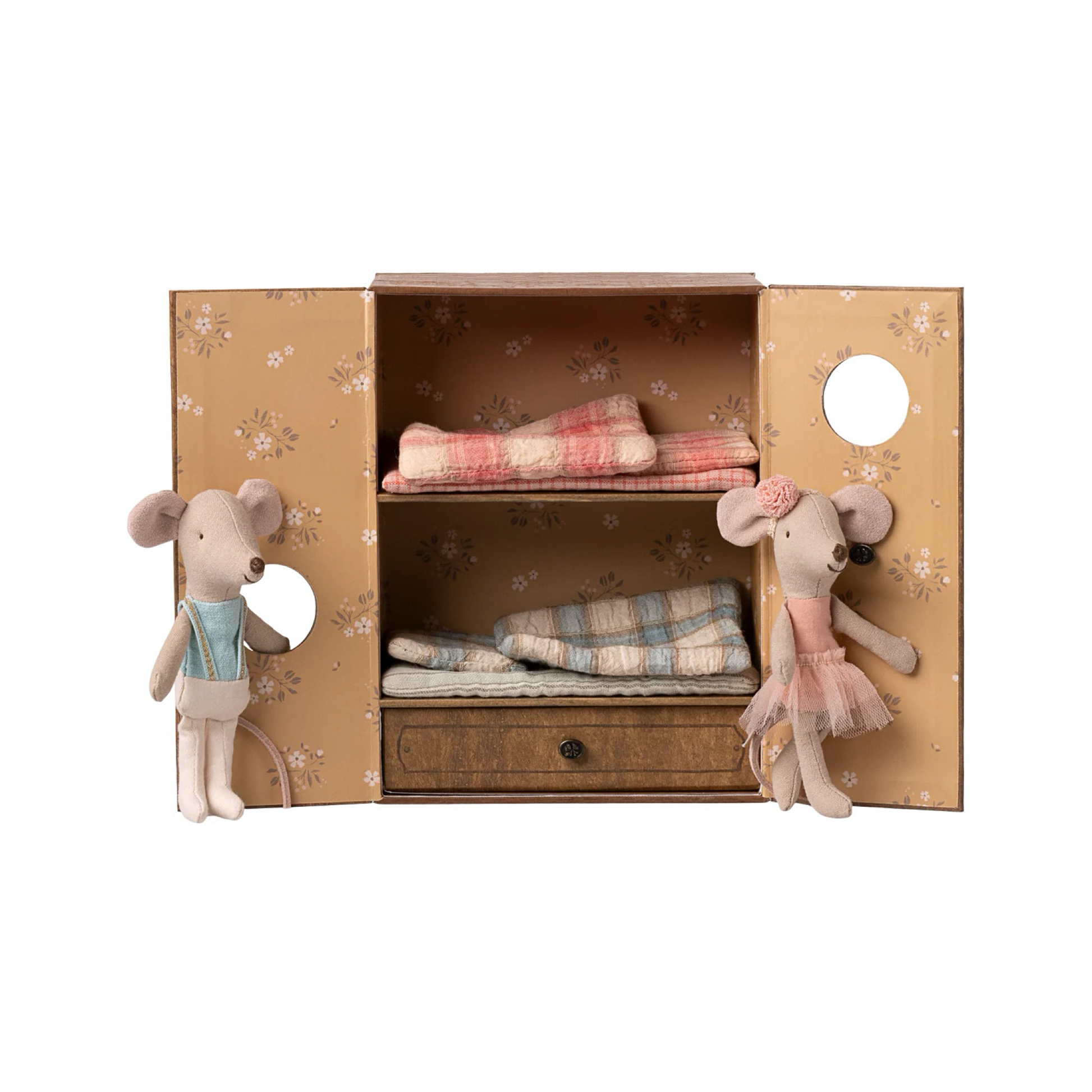 Open the doors of this magical playset and explore a world of dance, stardust and storytelling. This enchanting set transforms from a cosy mouse house to a ballet studio where dreams take centre stage. The mirrored wall glimmers while the magnetic barre holds fast to every tiny paw as the mice rehearse their grand performance. Two ballet mice, already dressed for the spotlight, wait eagerly in their beds, ready to twirl and tell their stories on stage.