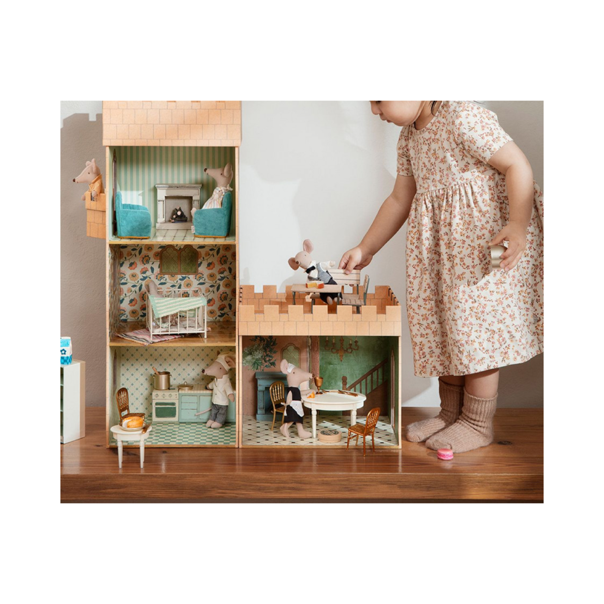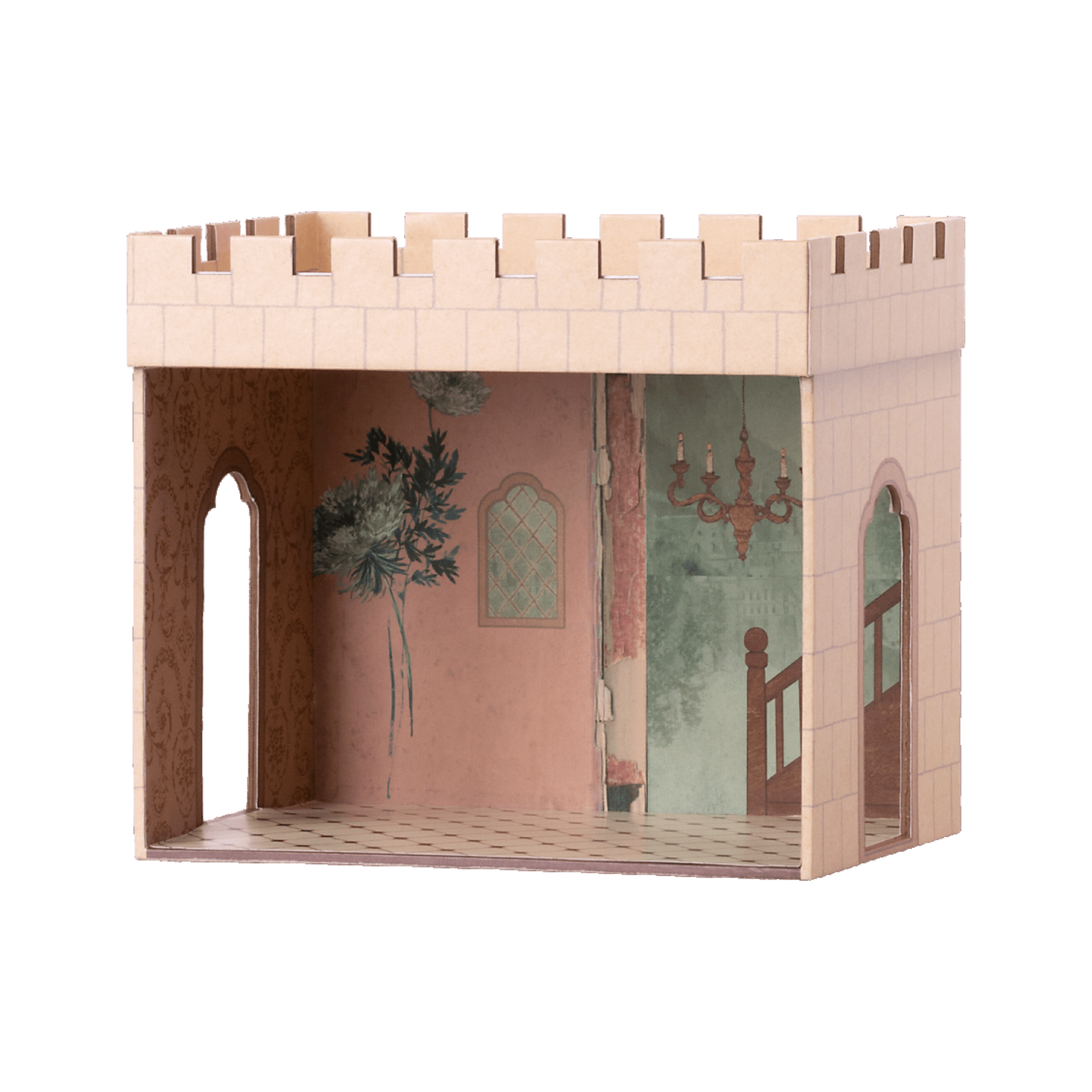 This castle is a beautiful home for all mice. It is made of cardboard covered by unique Maileg prints. Use it as a small home for your mice or as a connecting hall for the two Maileg castles.