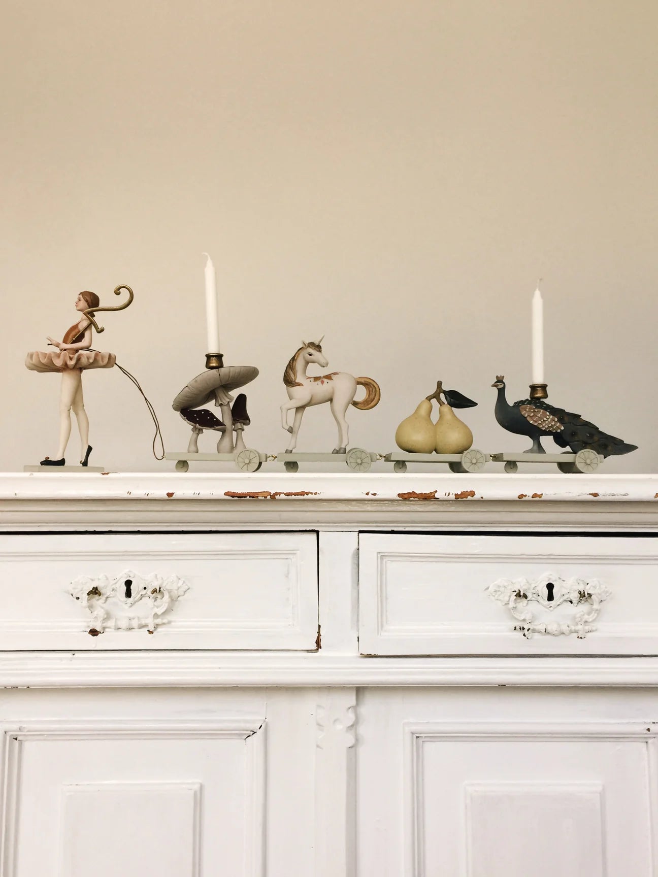 - Ballerina walking with mushrooms, a unicorn, pears and a peacock