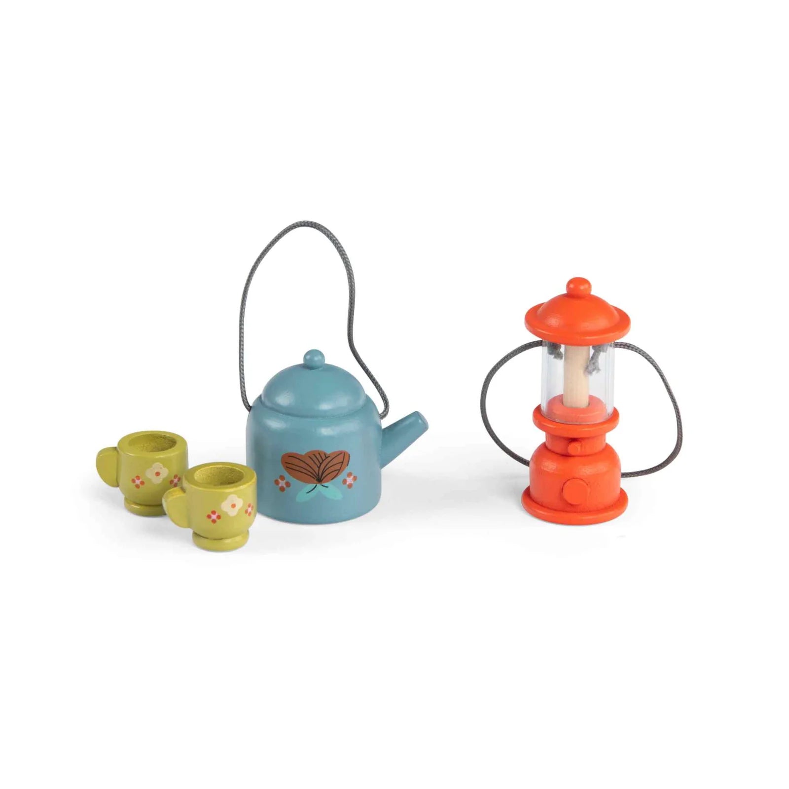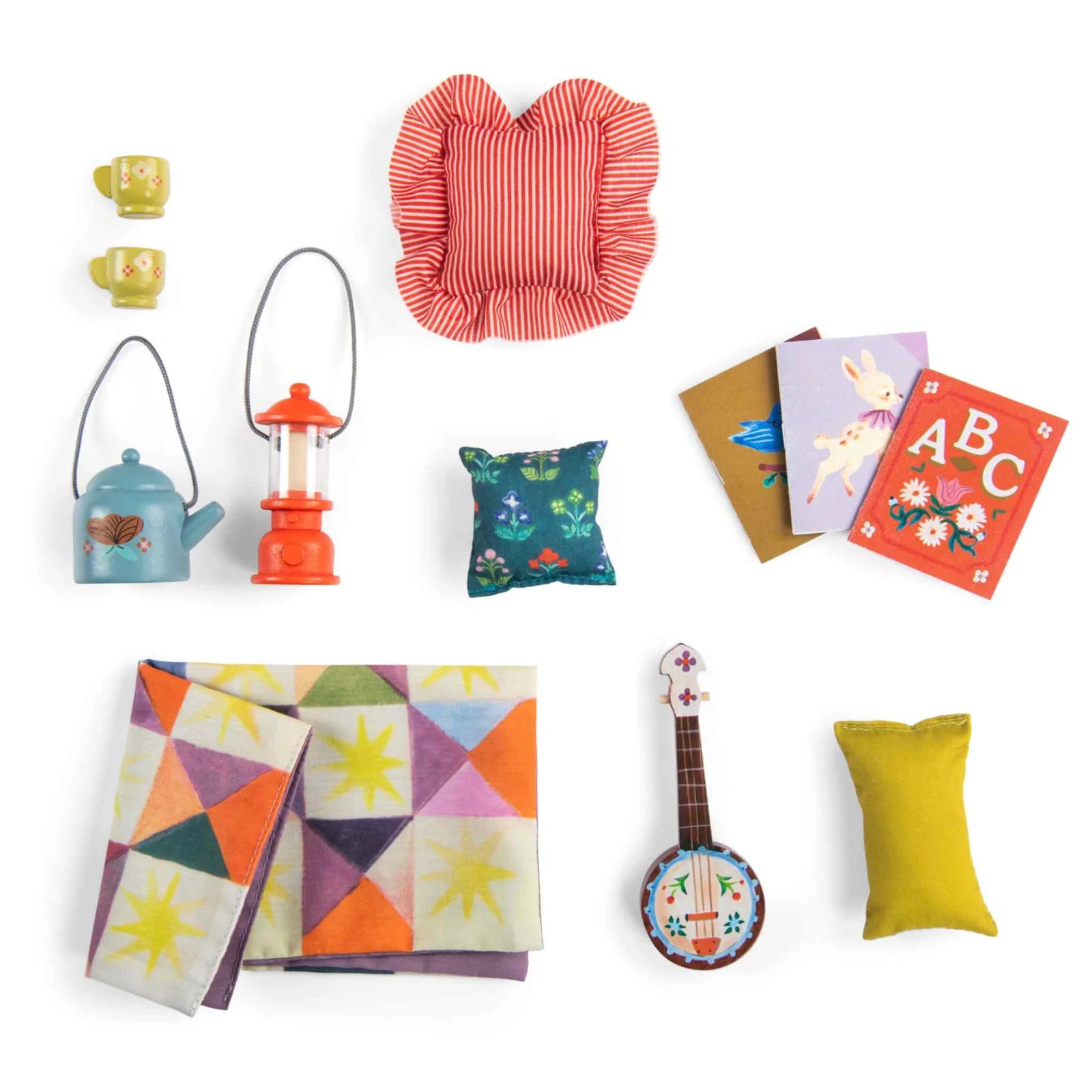 ในเซ็ตประกอบด้วย แบนโจ ผ้าห่ม โคมไฟ กาน้ำชา แก้วไม้ 2 ใบ หนังสือ 3 เล่ม และหมอนอิง 3 ใบ